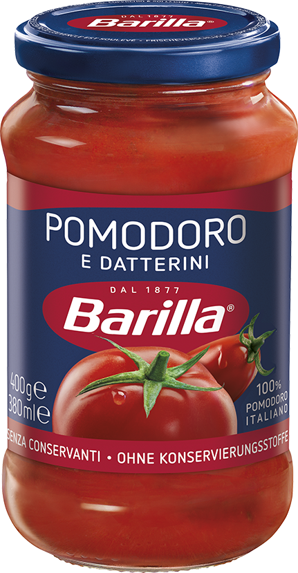 Ideale con le Penne Rigate, il Sugo con Pomodori e Datterini Barilla è pronto da versare direttamente sulla pasta appena scolata. Per esaltare profumo e sapore degli ingredienti si consiglia di scaldarlo a fuoco lento o nel microonde, dopo aver aperto il vasetto.