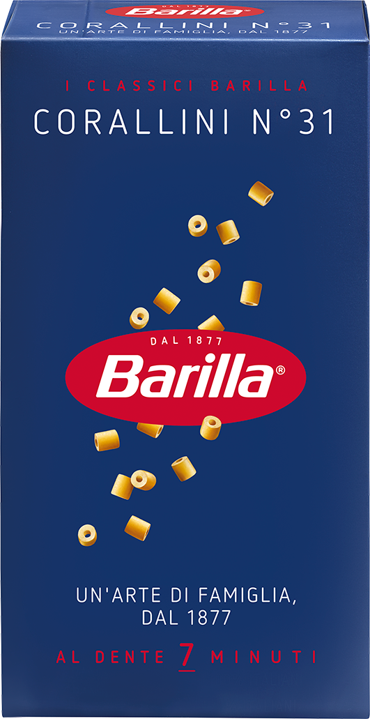 I Corallini richiamano un tipico ornamento femminile, un tempo diffuso nelle zone costiere del Mediterraneo, dove il corallo si pescava lungo tutta la costa. I Corallini Barilla hanno l’aspetto essenziale ed elegante di minuscoli tubetti, cortissimi e di forma liscia. Abili nel trattenere il brodo o i passati, che si incanalano nel loro minuscolo spiraglio, rappresentano una raffinata alternativa nella scelta delle pastine.