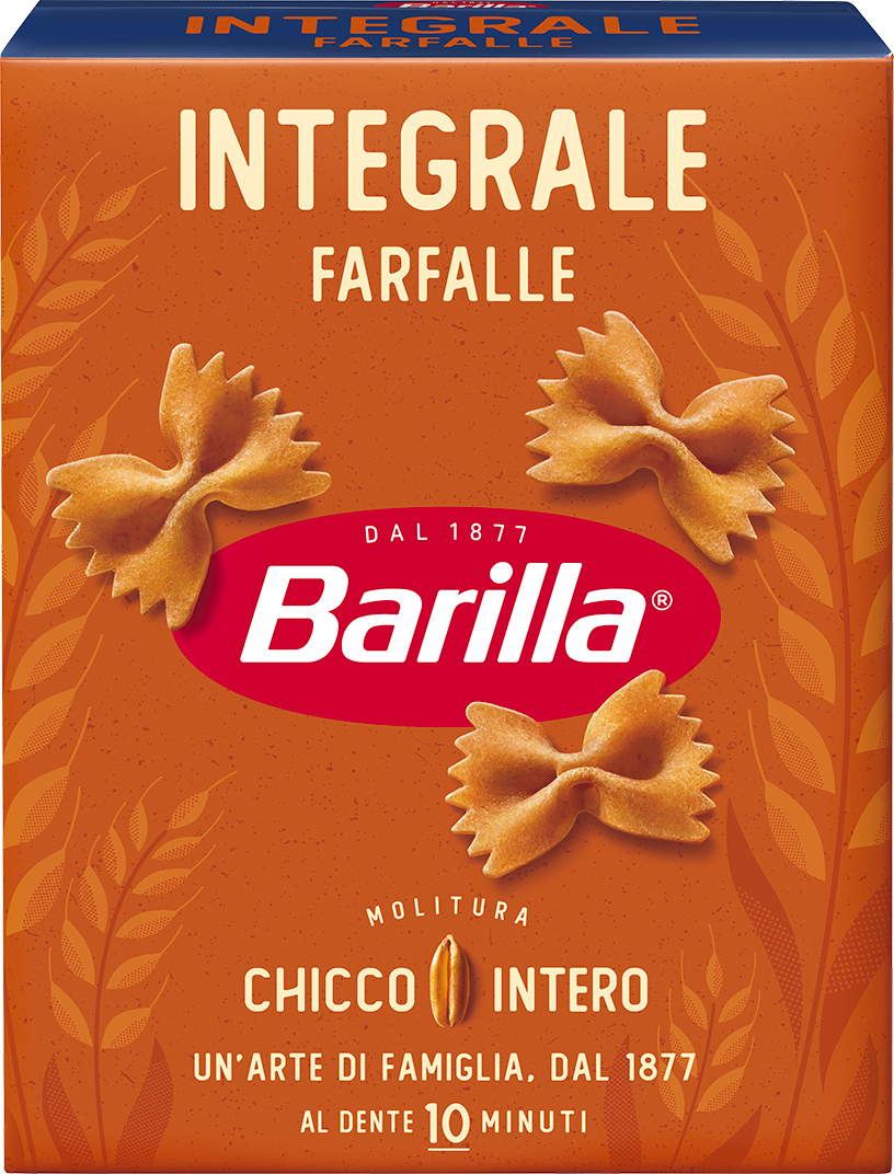 Il sapore più pieno e la perfetta consistenza sono frutto del metodo di macinazione delicata, che preserva tutta la bontà del grano. Tra le forme più allegre in cucina, le Farfalle Barilla Integrale si ispirano alla leggerezza e alla vivacità della natura, portando in tavola colore e fantasia. La loro superficie liscia e delicata si svela al palato attraverso una differente consistenza tra la parte centrale più spessa e le due estremità. Questa particolare forma le rende particolarmente adatte a condimenti leggeri e delicati.