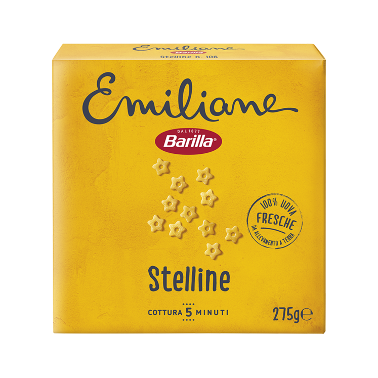 Le Stelline all’uovo Emiliane Barilla sono minuscole stelle di pasta all'uovo che stimolano gusto e fantasia a tutte le età. Preparate con uova fresche, le Stelline all’uovo trasformano ogni primo piatto in un’incantevole proposta.