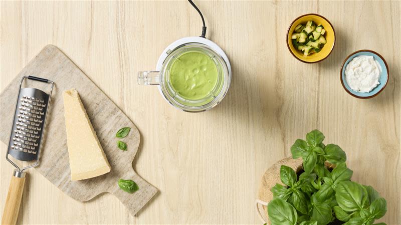 Rimuovi l'aglio dalla padella e frulla le zucchine con la ricotta, l'olio, sale, pepe e basilico fino a ottenere una crema liscia.