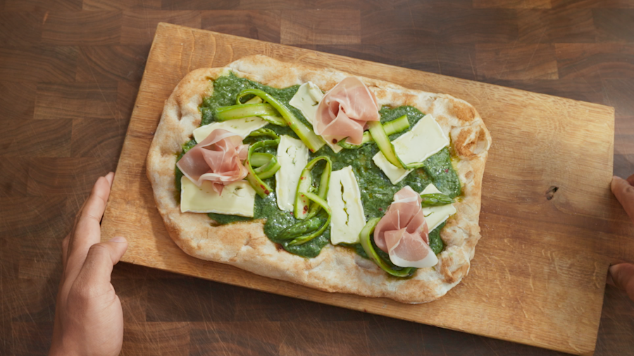 Pinsa romana con Pesto Barilla alla Genovese, asparagi marinati, brie e prosciutto di Parma