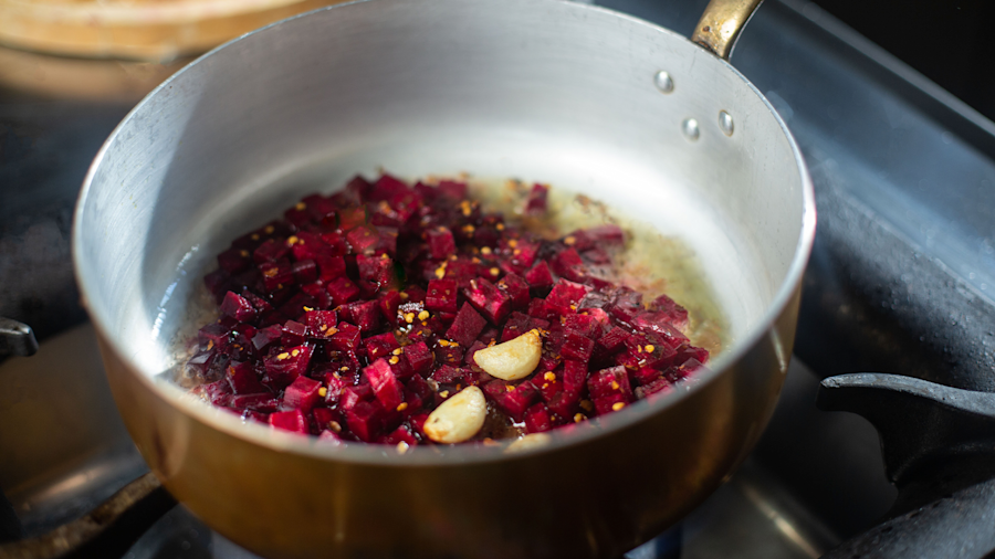 Preparare la base di un soffritto con aglio, olio, peperoncino e aggiungere la barbabietola precedentemente tagliata, portarla a cottura aggiungendo acqua poco alla volta se necessario. Una volta che le barbabietole hanno raggiunto il giusto punto di cottura, metterle in un frullatore e frullarle fino a ottenere un composto liscio