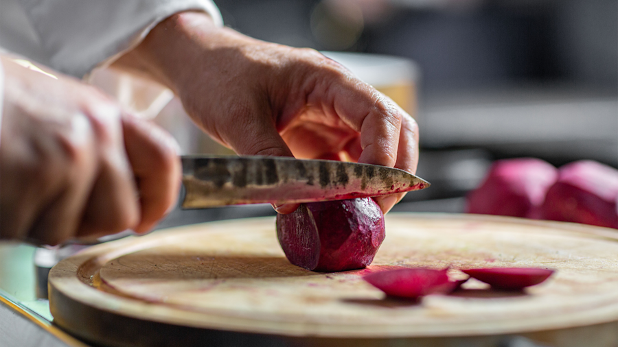 Pulire le barbabietole pelandole, poi tagliarle a pezzi omogenei.